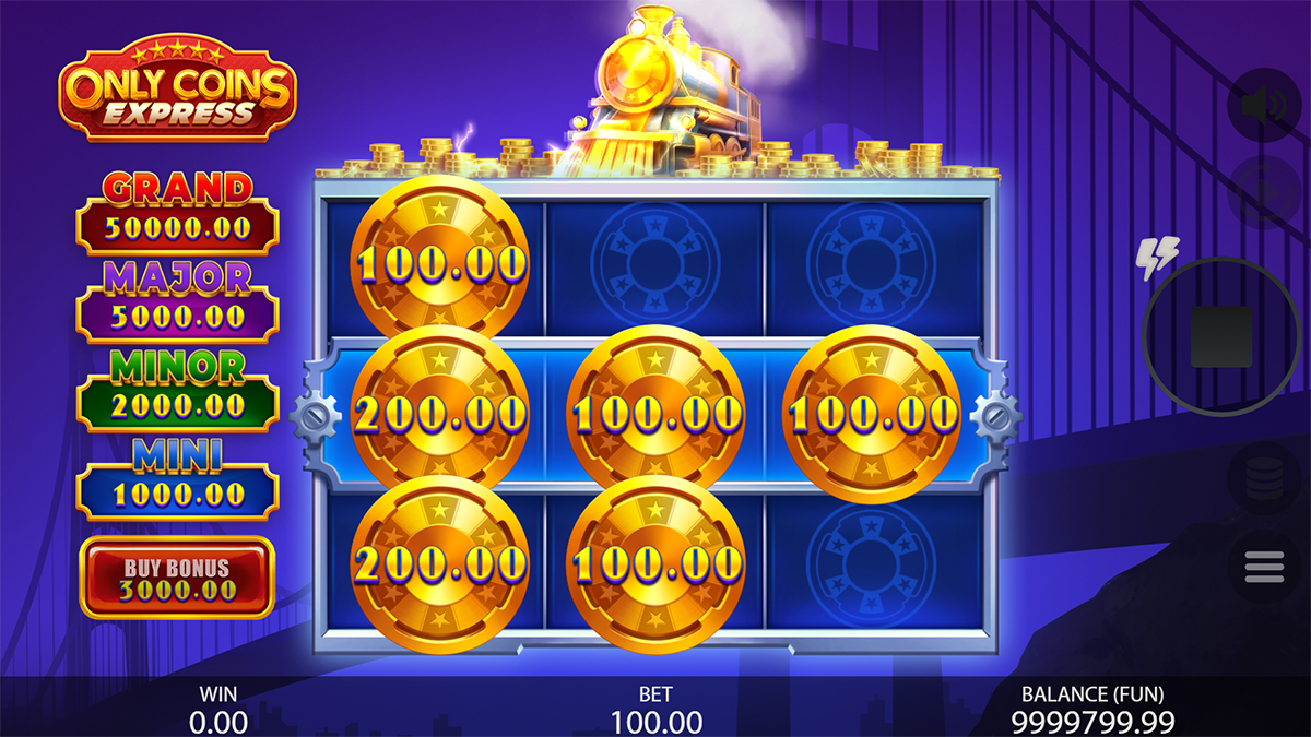Only Coins Express provides a flexible betting range suitable for all types of players, with bets starting at 0.10 credits and reaching up to 100 credits per spin. This wide range allows both casual players and high rollers to enjoy the game comfortably. With a maximum win of 2000x, even the smallest wagers can lead to significant payouts, while larger bets create opportunities for massive rewards.