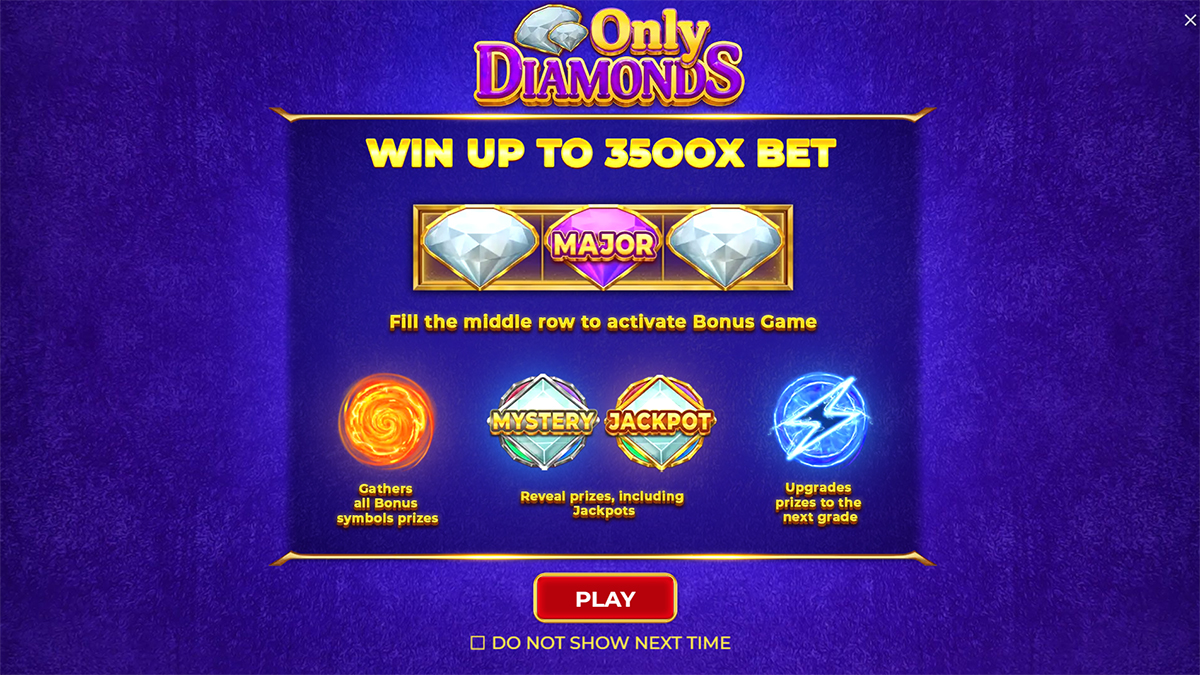 The maximum win in Only Diamonds is capped at an impressive 3,500x the player’s total bet. This top payout is achievable through optimal symbol combinations and strong performance during the Bonus Game. While not extreme, the max win is substantial enough to keep sessions thrilling, especially at higher bet levels.