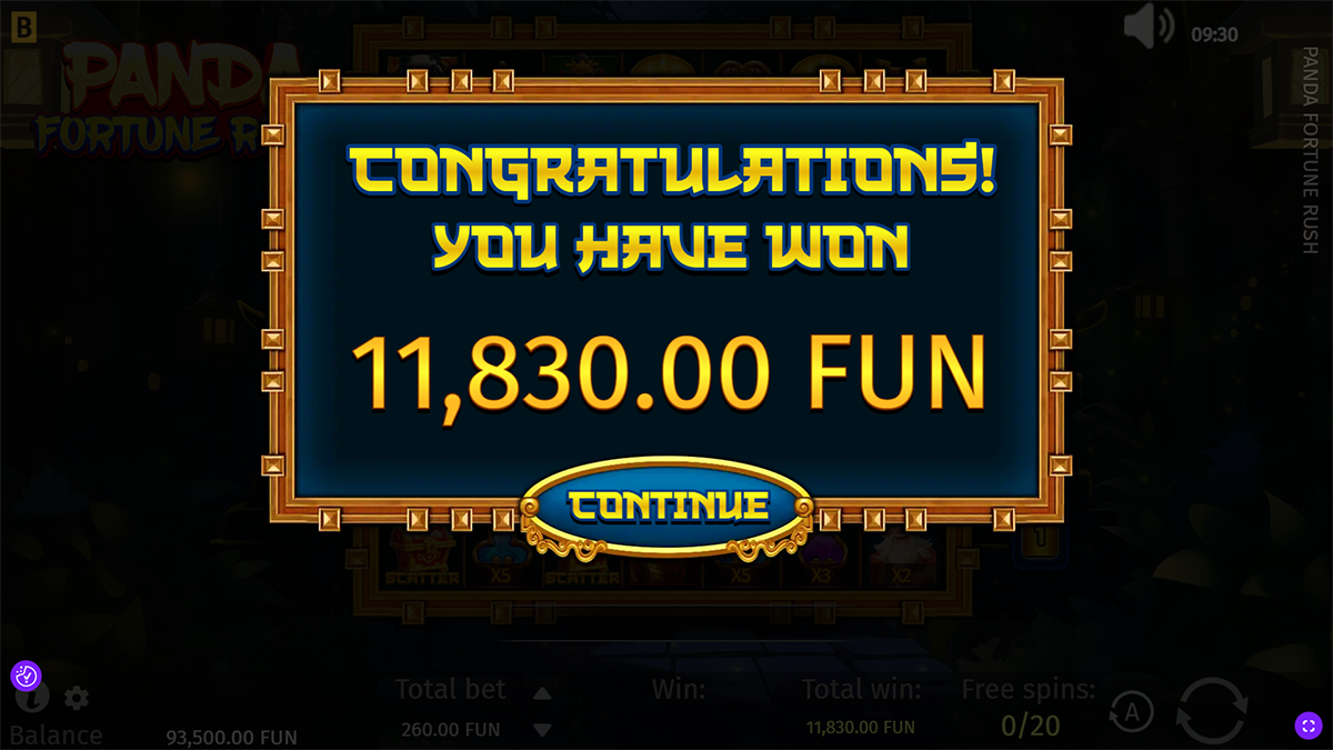 The betting limits in Panda Fortune Rush range from €0.20 to €260 per spin. This wide range accommodates both low-stakes players and high rollers. Regardless of the stake chosen, the maximum win remains capped at 1,750x the total bet.