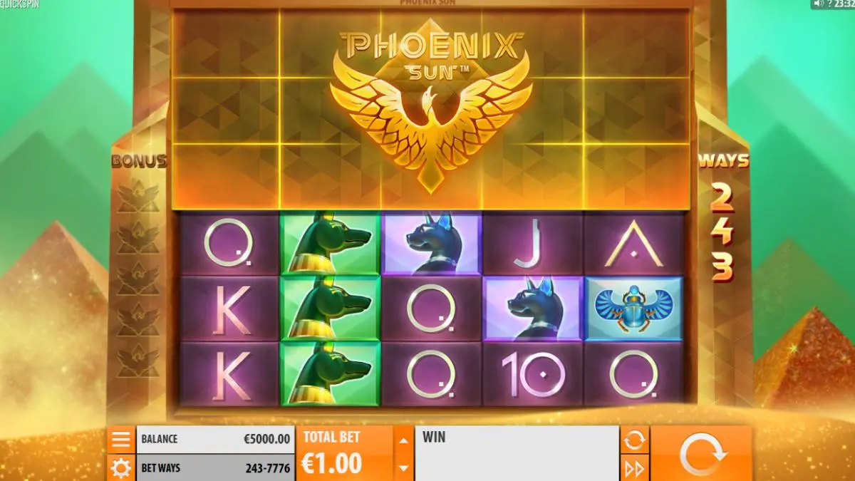 Phoenix Sun by Quickspin is a visually captivating slot that draws inspiration from ancient Egyptian mythology, featuring the legendary Phoenix as a symbol of rebirth and power. Set against a backdrop of golden pyramids and scorching deserts, the game begins with a standard 5x3 grid and 243 ways to win, but it can expand to a 5x6 layout with up to 7,776 ways. The main attraction is the game’s dynamic reel expansion mechanic, triggered during the base game when Phoenix Wild symbols appear. Each Phoenix Wild unlocks a tile above the reels, gradually opening additional rows and increasing the number of winning possibilities with every successful trigger.
