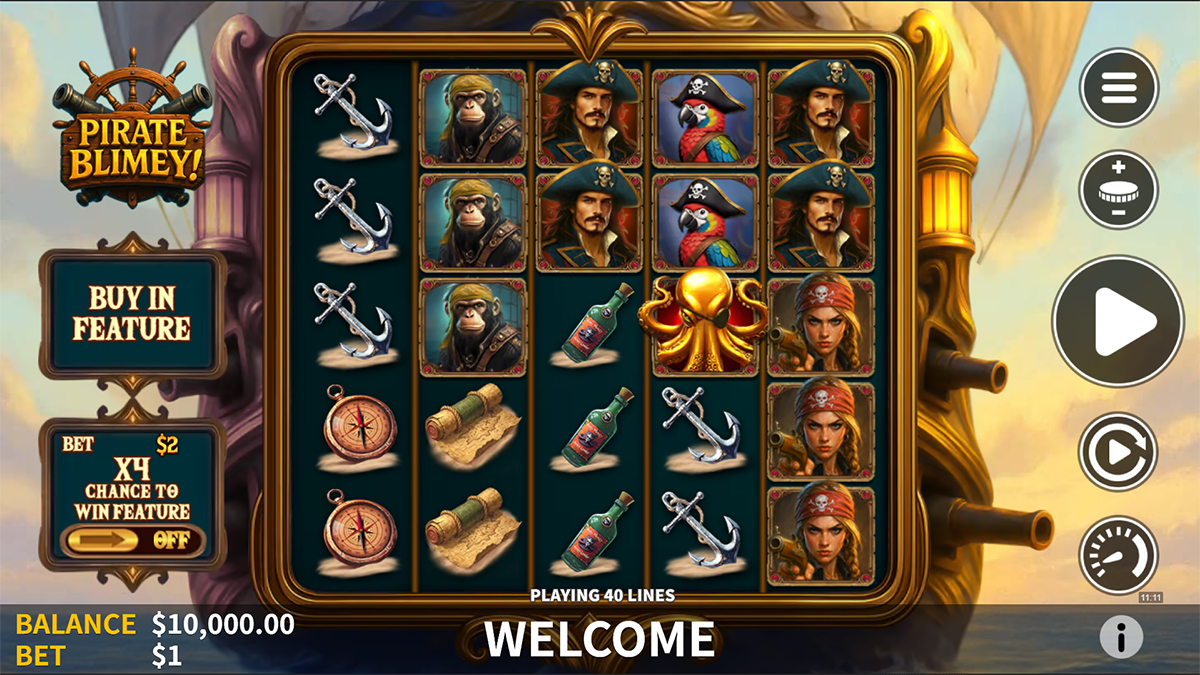 Pirate Blimey features 40 fixed paylines, ensuring that every spin carries numerous opportunities for creating winning combinations. These paylines remain active throughout the game, adding structure to the high-seas action. The combination of 40 lines and the Mystery & Nudge mechanic helps maintain a steady rhythm of wins, keeping the gameplay both engaging and rewarding.