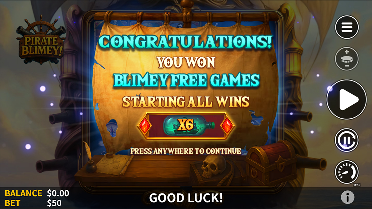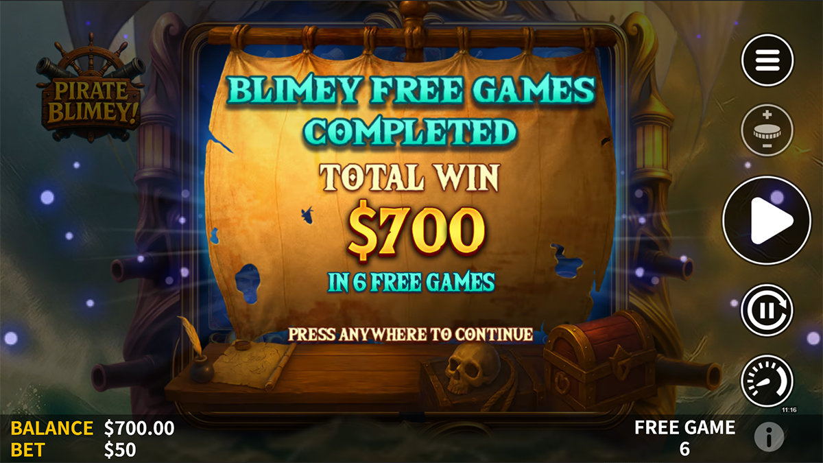 The Pirate Ship triggers the Blimey Free Games when 3–5 appear anywhere on the reels.