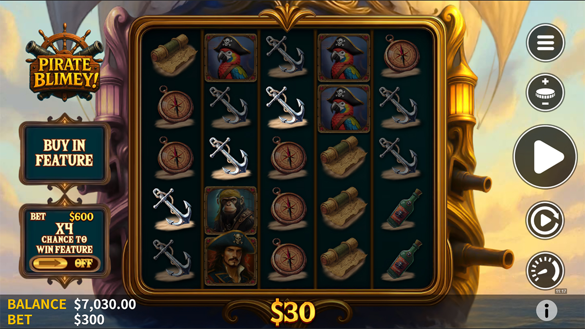 Pirate Blimey accommodates all types of players with bets ranging from a minimum of €0.10 to a maximum of €300 per spin. This broad range allows casual players to enjoy extended sessions while offering high rollers the opportunity for massive wins. With a maximum win of 20,000x, even the smallest bets can yield treasure-worthy results for those who dare to explore the high seas.