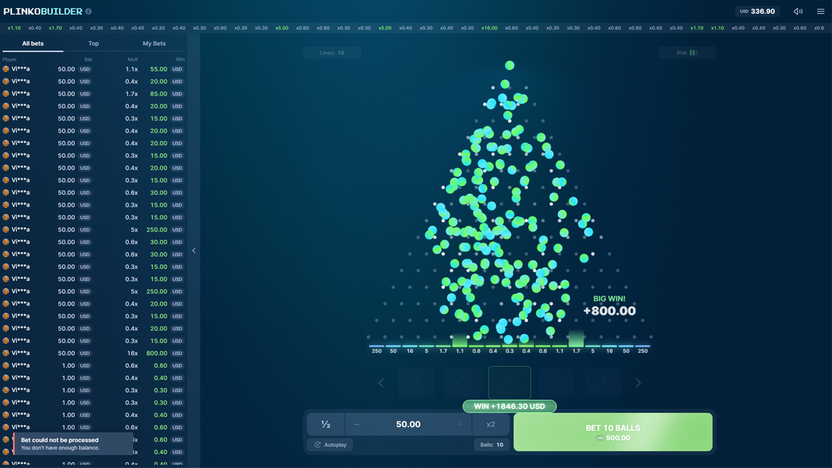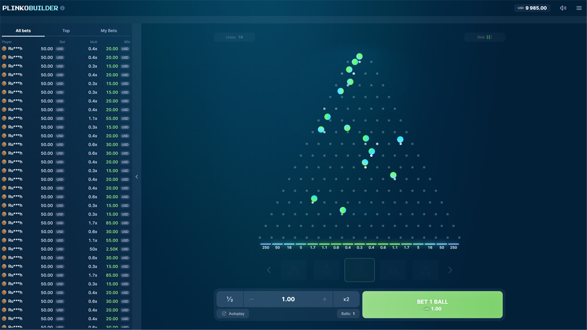 Plinko Builder presents a distinctive variation of the Plinko concept by introducing a customizable board system that allows players to influence the structure of each round. The combination of physics based ball movement and multiplier driven payouts creates a dynamic environment where every drop becomes an experiment in probability. With high volatility and a maximum win potential reaching 1000 times the wager, the game focuses on calculated risk and structural experimentation rather than traditional slot mechanics.