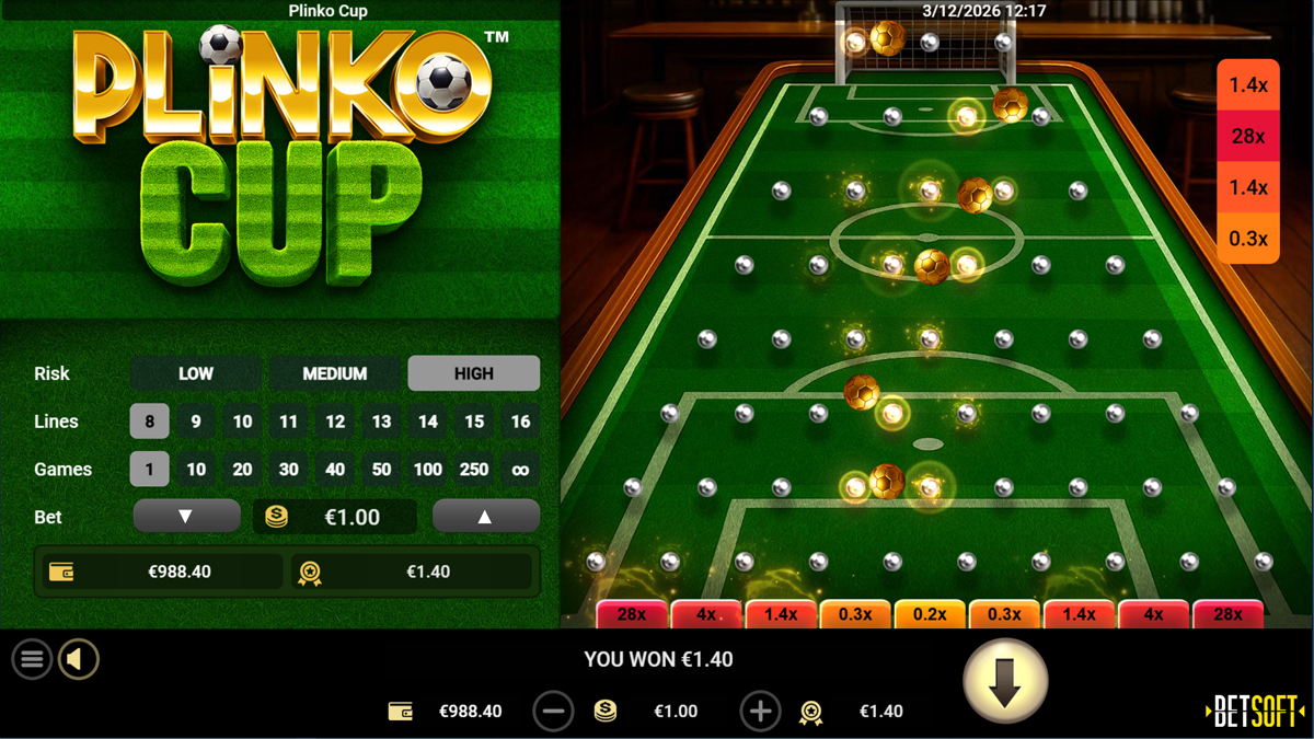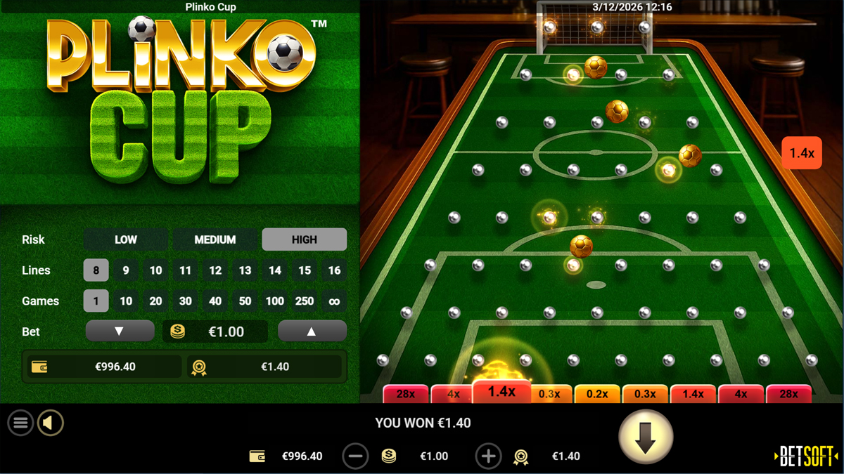Plinko Cup is a football themed Plinko instant win game developed by Betsoft. Players drop balls through a grid of pins where each bounce alters the trajectory before landing in multiplier goal slots at the bottom. With adjustable board settings, a betting range between 0.1 and 100, and a maximum win potential of 888 times the wager, the game focuses on fast paced drop mechanics and customizable gameplay sessions.