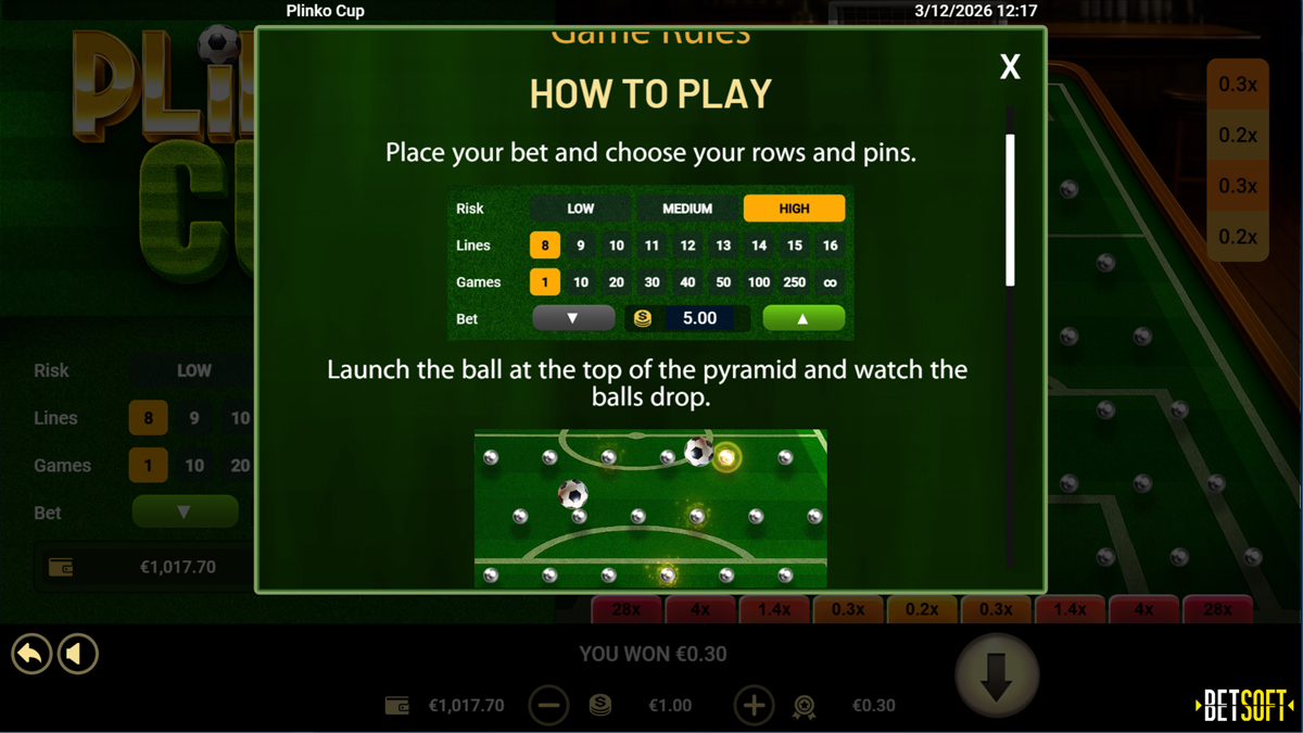 Plinko Cup is a football themed Plinko style instant win game developed by Betsoft that blends the unpredictable bounce mechanics of classic Plinko with the atmosphere of a stadium match. Instead of focusing on reels or paylines, the gameplay revolves around dropping balls from the top of a vertical board filled with pins, where they bounce unpredictably before landing in multiplier slots positioned at the bottom. The football theme is reflected through stadium visuals, arcade inspired graphics, and goal styled multiplier zones that represent scoring opportunities. One of the defining characteristics of Plinko Cup is the level of customization offered to players. Users can adjust several gameplay variables, including the number of balls released and the pin configuration on the board. These adjustments influence how the balls travel across the board and how many potential multiplier targets appear at the bottom. With a return to player value of 96 percent and a maximum win potential reaching 888 times the wager, the game emphasizes randomness, experimentation, and fast paced instant win outcomes.