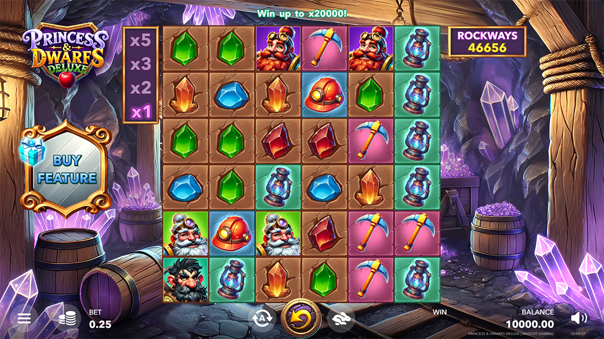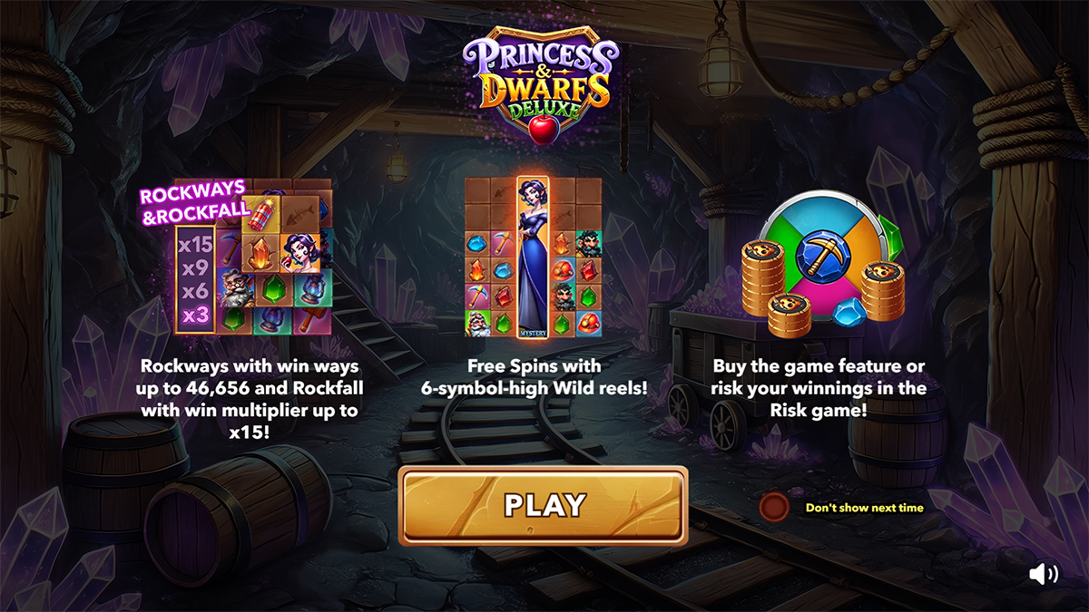 Princess & Dwarfs Deluxe by Mascot Gaming is a fantasy-inspired slot that takes players deep into a sparkling underground mine filled with dwarfs, treasures, and an empowered princess who controls the biggest wins. Unlike many fairy-tale themed slots that simply rely on visual charm, this game merges its enchanting story with mechanics designed to test both risk-taking and strategy. Featuring 6 reels and up to 46,656 ways to win through the Rockways system, every spin feels alive with unpredictability. The combination of cascading Rockfall wins, mystery symbols that double as wilds and scatters, and the unique Risk’n’Buy mechanic creates an experience where every decision counts. With a maximum win of 20,000x, the slot blends high volatility excitement with rewarding bonus rounds, offering a blend of risk, reward, and rich thematic design.
