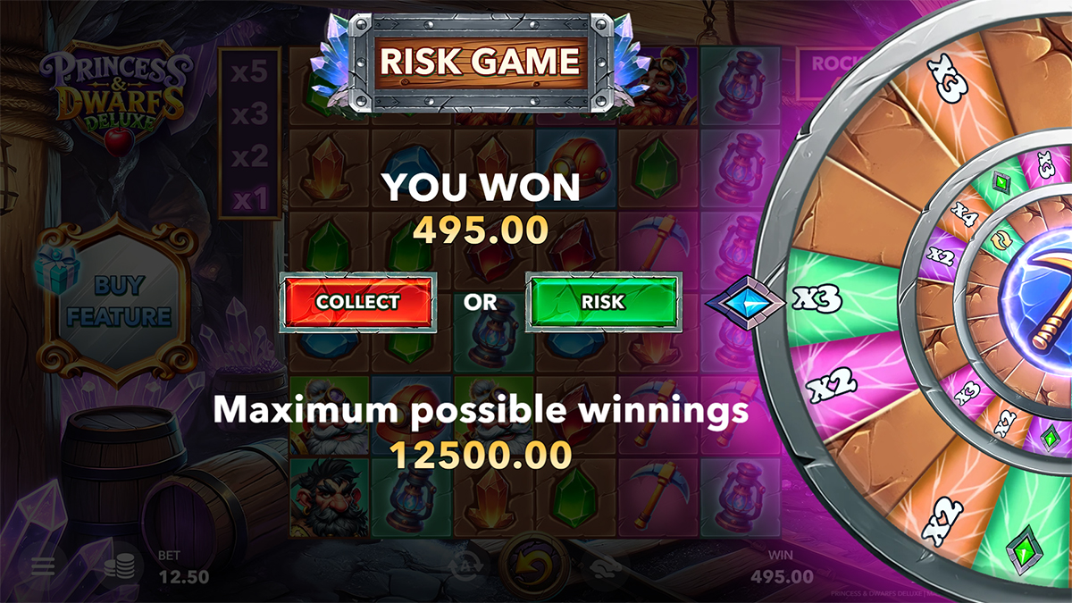 The gameplay in Princess & Dwarfs Deluxe is a multi-layered experience that keeps players engaged at every step. With its Rockways payout system, each spin is unpredictable, as the number of symbols per reel changes dynamically, altering the number of active ways to win. This creates a fresh playing field each round and ensures no two spins feel the same. On top of this, the Rockfall cascading reels system turns even a single win into a potential chain reaction of payouts, building both anticipation and reward. The addition of the Risk’n’Buy feature transforms the gameplay from passive spinning to active decision-making, requiring players to weigh risk versus reward after every win.
