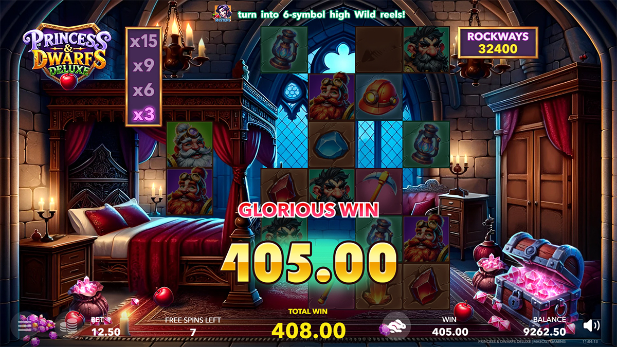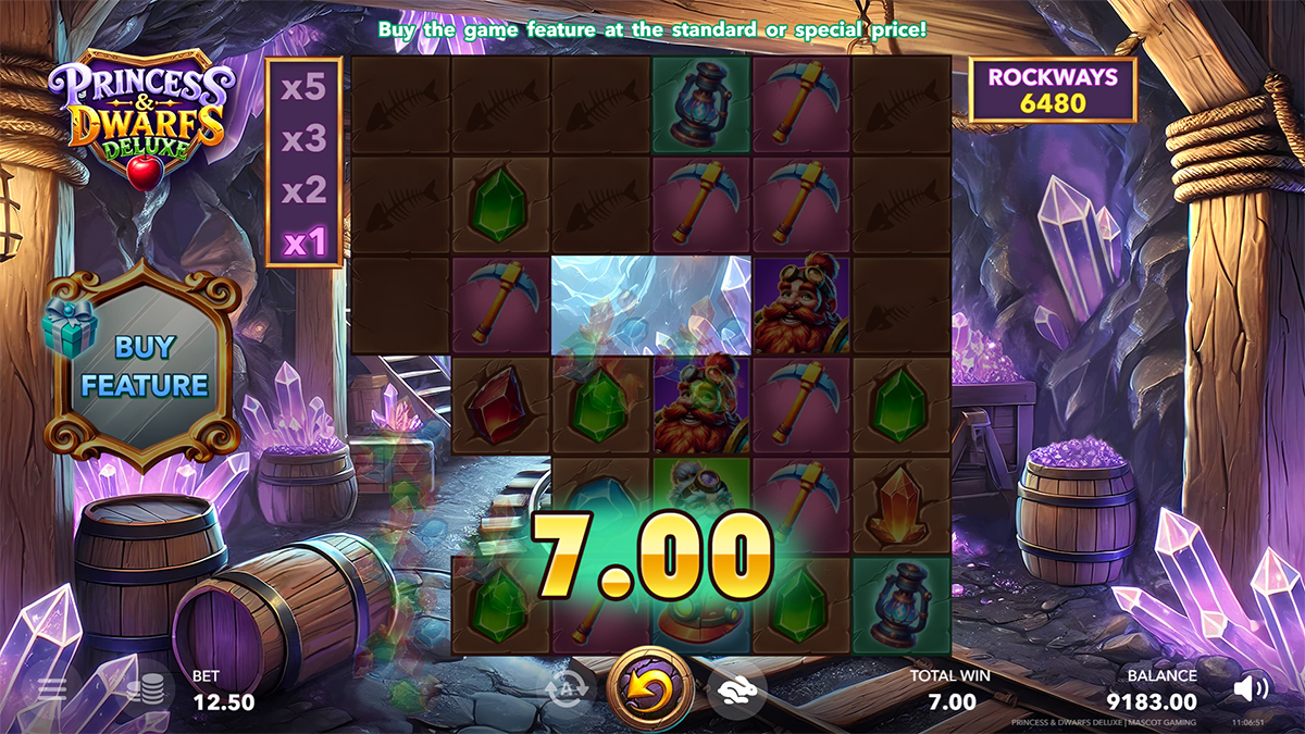 Princess & Dwarfs Deluxe by Mascot Gaming is more than just a visually appealing slot—it is a complete gameplay package that demands both attention and strategy. The Rockways system keeps every spin unpredictable with up to 46,656 ways to win, while the Rockfall feature ensures that even small wins can cascade into significant payouts when multipliers are factored in. The Princess Mystery symbol adds depth by serving as both Wild and Scatter, leading players into the lucrative Free Spins round where multipliers climb as high as x15 and expanding wild reels dominate the grid. The Risk’n’Buy mechanic separates this slot from the competition, giving players agency over their journey by offering chances to gamble winnings or purchase direct access to bonuses. The combination of these mechanics results in a game that balances spectacle, strategy, and substantial payout potential, making it a highlight within Mascot Gaming’s portfolio.