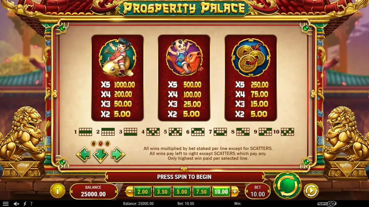 Prosperity Palace has 10 fixed paylines arranged over a 5×3 layout, paying left to right. All line wins must begin on the first reel, and only the highest win per line is counted.