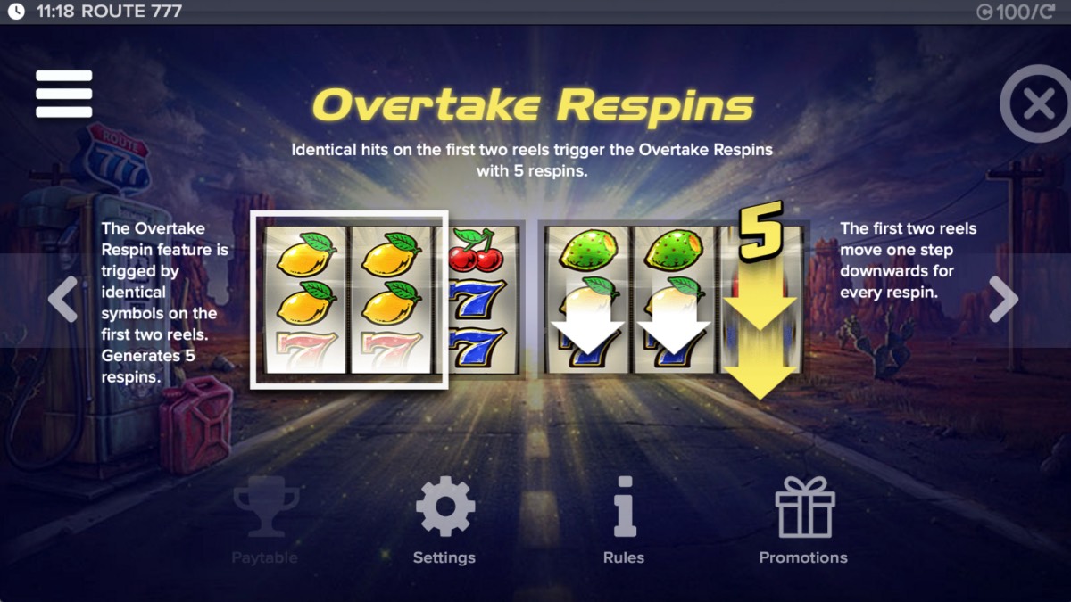 Overtake Respins | Triggered when identical symbols land on the first two reels; awards five respins, with the first two reels moving down one step per spin. |