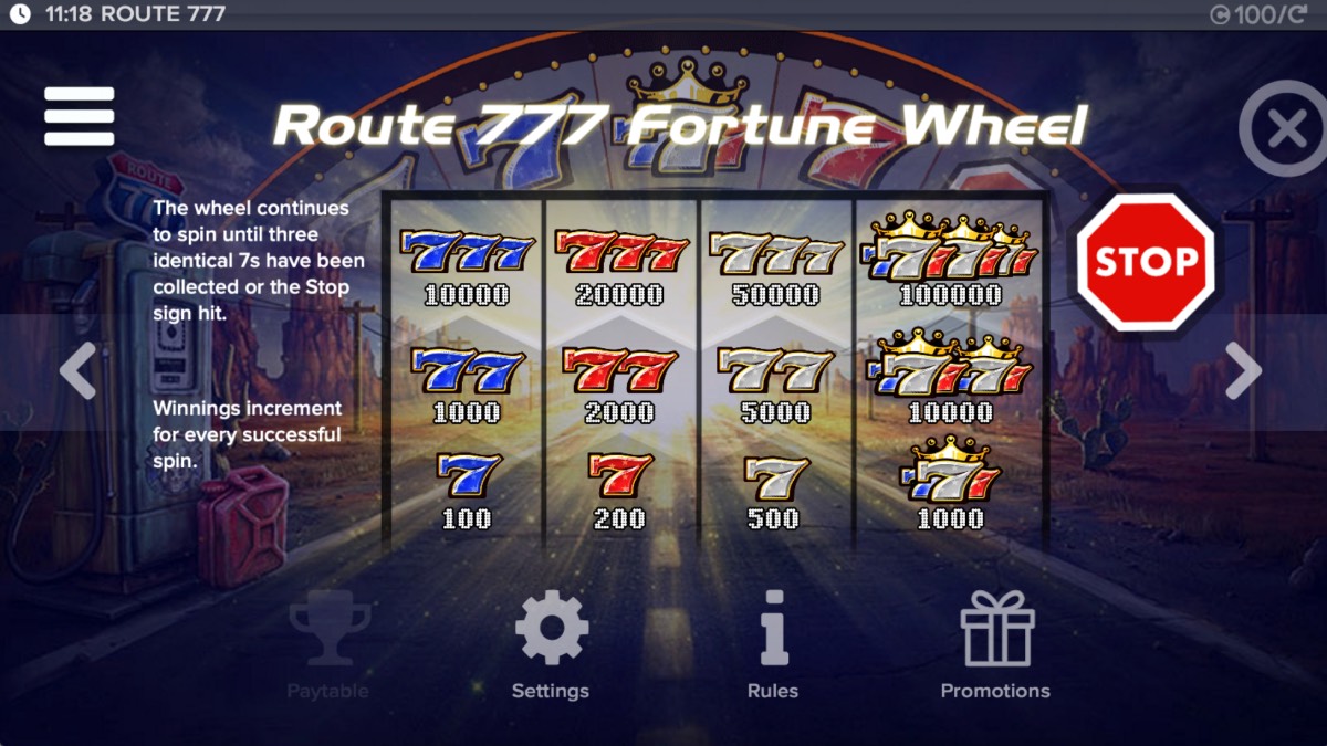 Route 777 by ELK Studios is a classic fruit-themed slot featuring a 3x3 layout with 17 paylines and nine symbols. It offers an RTP of 96.3% and high volatility, appealing to players seeking the chance for substantial wins. Betting ranges from a minimum of $0.20 to $100, catering to both casual players and high rollers. Key symbols include fruit icons and high-value 7s, with crowned 7s offering up to 70x the stake. Features include Overtake Respins, Free Spins, and the Fortune Wheel, adding depth to gameplay.