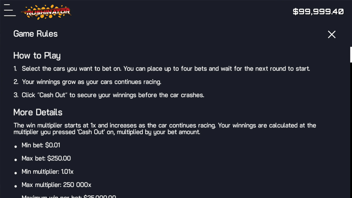 The true “X-factor” in a round of Rushinator is the Random Multiplier boost, which can turn a standard sprint into a record-breaking windfall at any moment. During the race, the car may trigger a “Nitro” effect, causing the multiplier to skip ahead at a much faster rate than the standard climb. This unpredictable surge in speed is designed to test your nerves, as the potential for a massive payout increases alongside the immediate risk of a high-speed wreck. To play effectively, you must stay focused on the Live Statistics panel, which tracks the crash points of previous rounds, helping you gauge the current “rhythm” of the RNG. Whether you are a “scalper” taking small wins at 1.10x or a daredevil waiting for the four-figure peaks, the gameplay is a relentless test of human intuition against a high-performance mathematical engine.