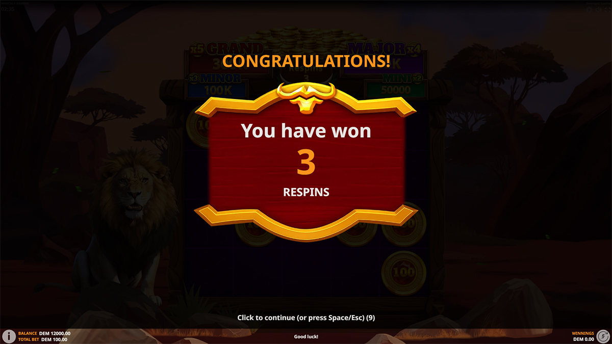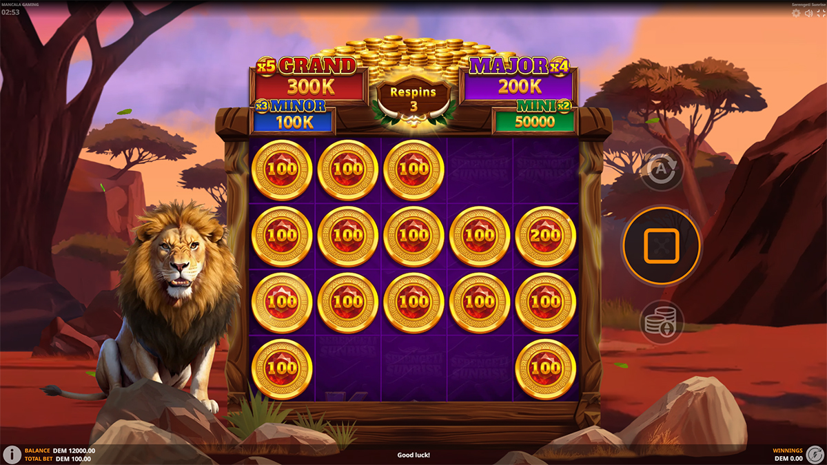 Serengeti Sunrise replaces traditional free spins with a Hold and Win Bonus Game that uses respins instead of standard reel spins. This feature is triggered by landing enough coin symbols to enter the bonus grid where coins lock and resets occur. Although there are no free spins, the respin-based mechanic serves the same purpose with higher win potential.