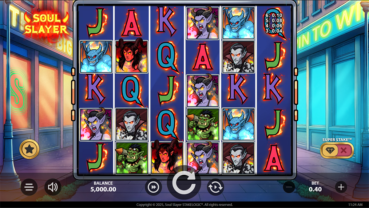 Soul Slayer features 40 fixed paylines that keep every spin engaging and full of potential. These paylines ensure numerous opportunities for symbol combinations and Wild-triggered wins across its 6×5 grid. Each line contributes to the game’s fast-paced flow, making it ideal for players who enjoy consistent action.