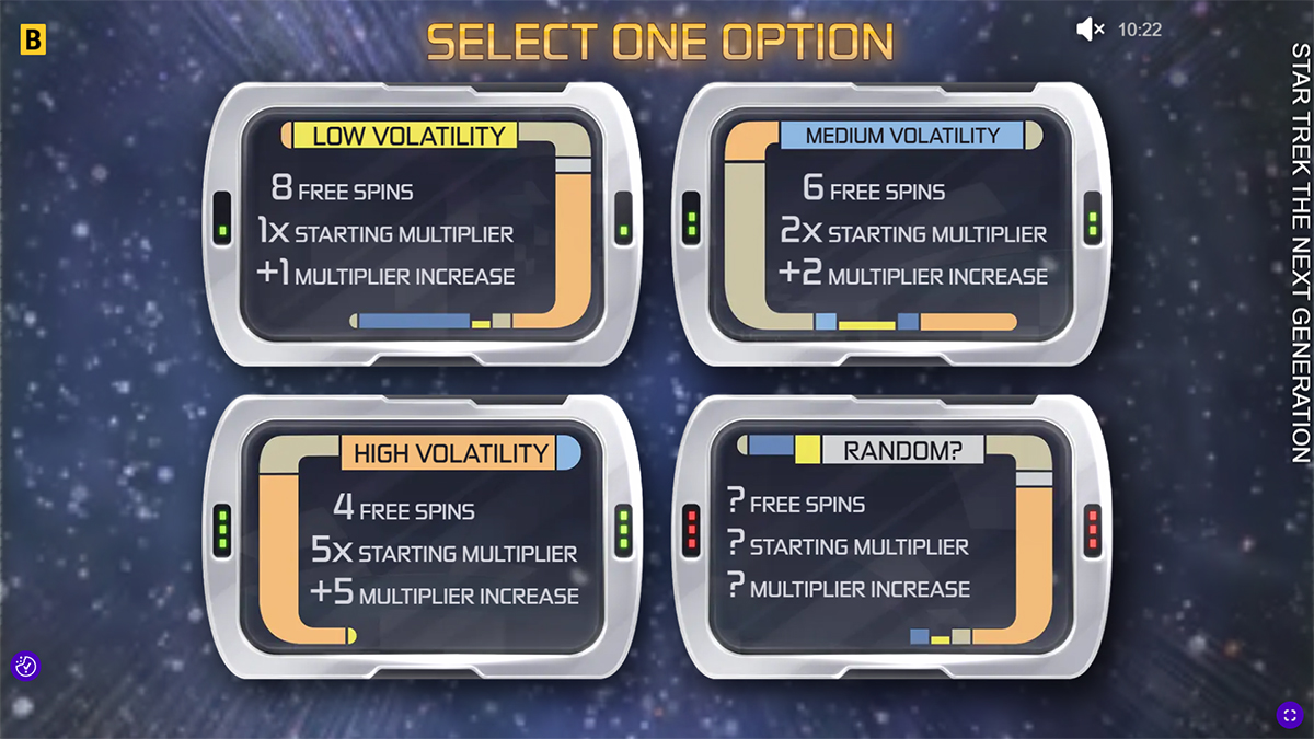 Yes, Star Trek™ The Next Generation includes a Free Spins round that activates when three Enterprise symbols land on reels 1, 3, and 5. Once triggered, players choose from low-, medium-, high-volatility, or random modes, each with unique multipliers and retrigger mechanics. This feature becomes one of the most thrilling segments of the game due to unlimited retriggers and rising cascading multipliers.