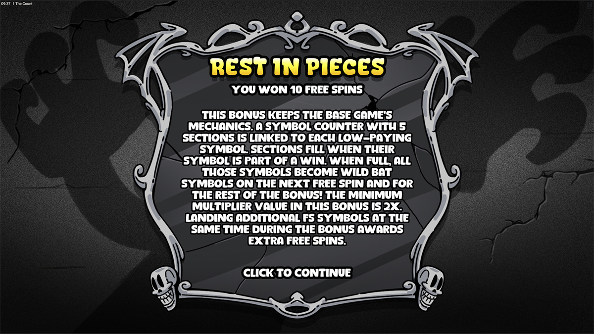 Rest in Pieces Bonus 10 free spins with a Symbol Counter that transforms low-paying symbols into Wild Bats when filled.