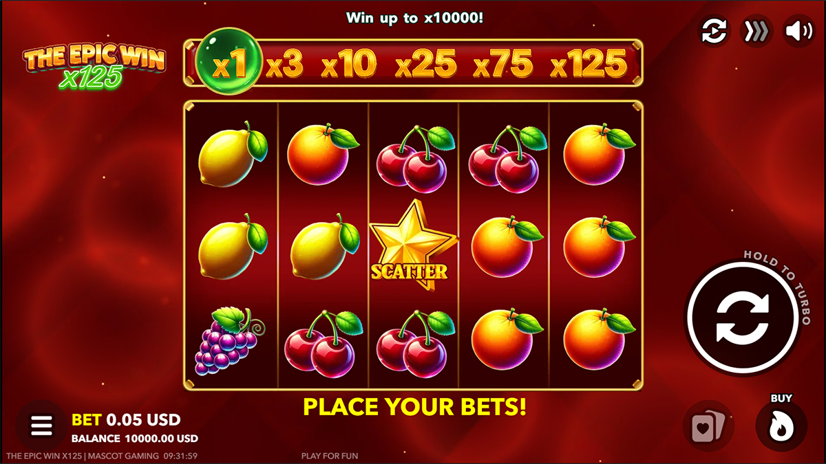 The Epic Win x125 is a classic fruit-themed video slot that blends old-school simplicity with modern risk-driven mechanics, creating a game that feels familiar yet constantly tense. Built on a 5×3 reel layout with just five paylines, the slot focuses on clean visuals, fast spins, and escalating potential through its signature win multiplier system. What really defines the experience is the sense of momentum, as every losing spin pushes the multiplier higher, making each next spin feel more important than the last. Combined with iconic fruit symbols, lucky sevens, and stars, the game delivers a nostalgic casino atmosphere while still appealing to players who enjoy high volatility and big-win potential. With a maximum win of x10,000 and a top multiplier of x125, The Epic Win x125 is clearly designed for players who enjoy risk, patience, and explosive payouts.