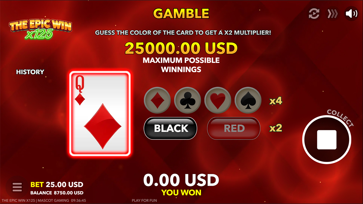 The Epic Win x125 focuses on a small but impactful set of features designed to amplify risk and reward rather than overwhelm the player. The escalating win multiplier adds constant tension, while the gamble option allows players to push their luck even further after a win. Bonus Buy functionality provides instant access to free rounds for those who prefer controlled risk and faster action.