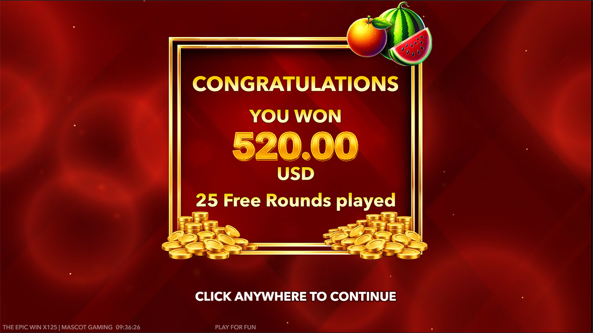 The Epic Win x125 stands out as a slot that proves simplicity can still deliver intense and memorable gameplay when paired with smart, risk-focused mechanics. By stripping the format down to five reels and five paylines, Mascot Gaming places all the attention on momentum, anticipation, and explosive payout potential driven by the escalating win multiplier. Every non-winning spin feels purposeful, as it steadily builds toward higher multiplier tiers that can completely transform even modest symbol combinations into significant wins. The addition of multiplier wilds, a flexible gamble feature, and a Buy Free Rounds option further reinforces the game’s identity as a high-volatility experience designed for players who enjoy tension and bold decisions. Overall, The Epic Win x125 successfully blends classic fruit-slot nostalgia with modern volatility mechanics, making it a compelling choice for thrill-seekers who value big-win potential over frequent small payouts.