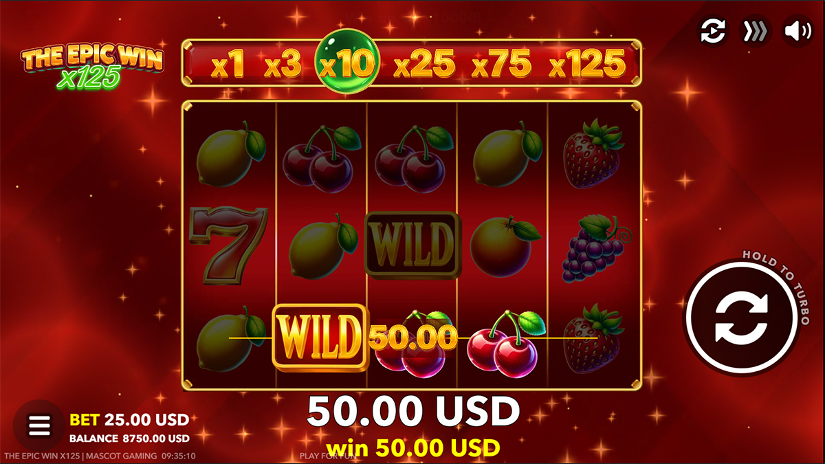 Mechanically, The Epic Win x125 revolves around its escalating win multiplier system, which increases after every losing spin and can reach up to x125. The multiplier progresses through fixed stages—x1, x3, x10, x25, x75, and finally x125—adding structure and anticipation to the experience. Once a winning spin occurs, the multiplier immediately resets to x1, reinforcing the high-risk, high-reward nature of the game. Each bet level has its own independent multiplier progression, meaning changing your stake resets the buildup, which encourages commitment to a chosen bet size. Additional mechanics include wild symbols with built-in multipliers and a gamble feature, both of which further amplify the potential volatility and payout swings.