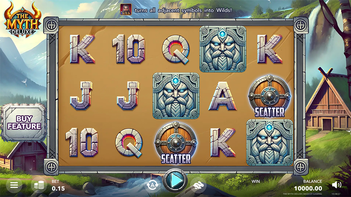 The special symbols are the true driving force behind The Myth Deluxe’s gameplay identity. The Viking Wild substitutes for all symbols except Scatters and appears only on reel three, converting all adjacent symbols into Wilds and significantly boosting win potential. The Skadi Wild also substitutes for all non-Scatter symbols but appears on reels one and five, transforming the entire reel into a Wild reel for maximum impact. Scatter symbols, which appear on reels one, three, and five, are responsible for triggering the Free Spins feature when three land simultaneously. Together, these special symbols create dynamic reel behavior and ensure that no two feature-triggering spins feel exactly the same.