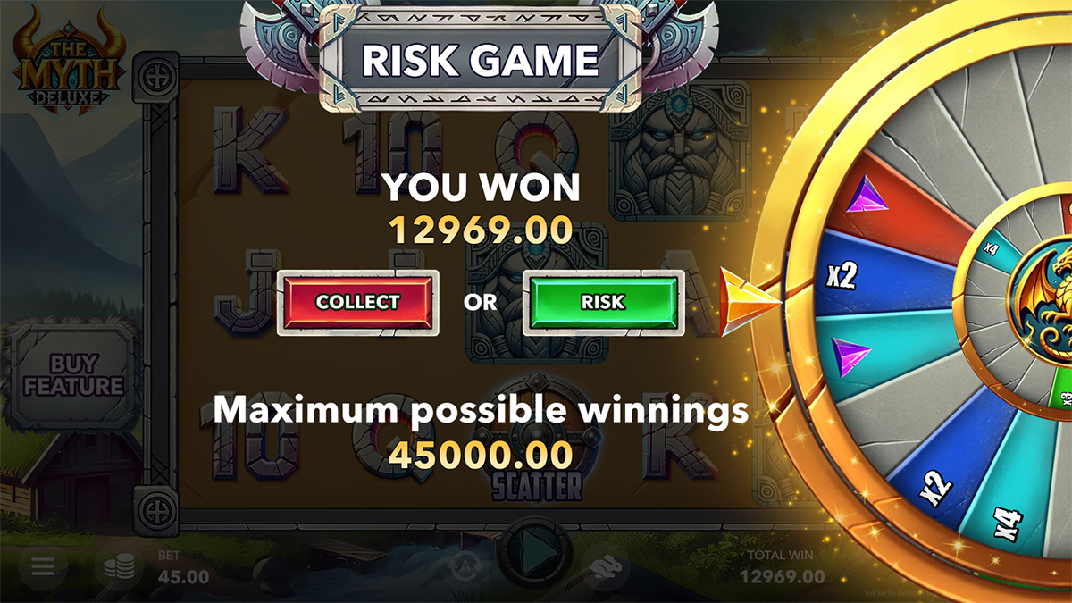 While The Myth Deluxe does not explicitly state a fixed maximum win cap, the game allows winnings to scale dramatically through its Risk game, where a multiplier of up to x1000 of the total bet can be achieved. This means that the maximum attainable win is closely tied to both the player’s bet level and their willingness to engage with the Risk’n’Buy feature after securing a win.