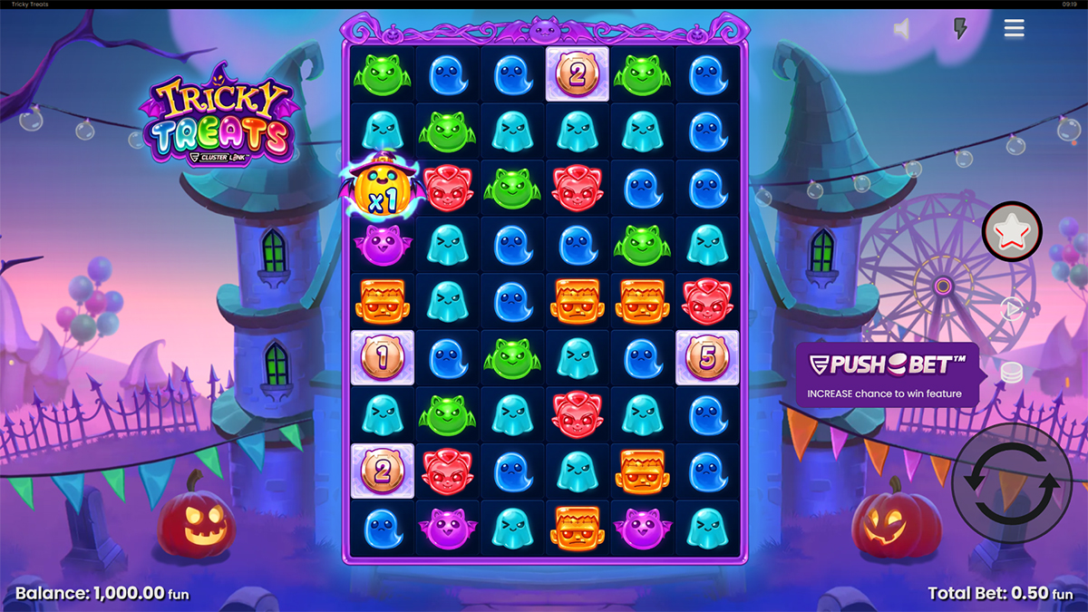 Beneath the fun and colorful surface, Tricky Treats operates on complex but well-balanced mechanics that push Push Gaming’s innovation forward. The cluster-pays mechanic ensures that every spin is full of potential, while special icons like Collectors and Multipliers add layers of strategic depth. The Wild Scatter symbol acts both as a substitute and a gateway to the Free Spins bonus, giving it dual functionality. During Free Spins, players encounter special reels populated exclusively with high-value symbols, ensuring a more intense and focused gameplay experience. Additionally, the Instant Prize and Multiplier systems interact with each other dynamically — for instance, multipliers enhance instant wins before transforming into new prize icons. These layered mechanics encourage continuous engagement and amplify replay value, as no two spins ever feel the same.