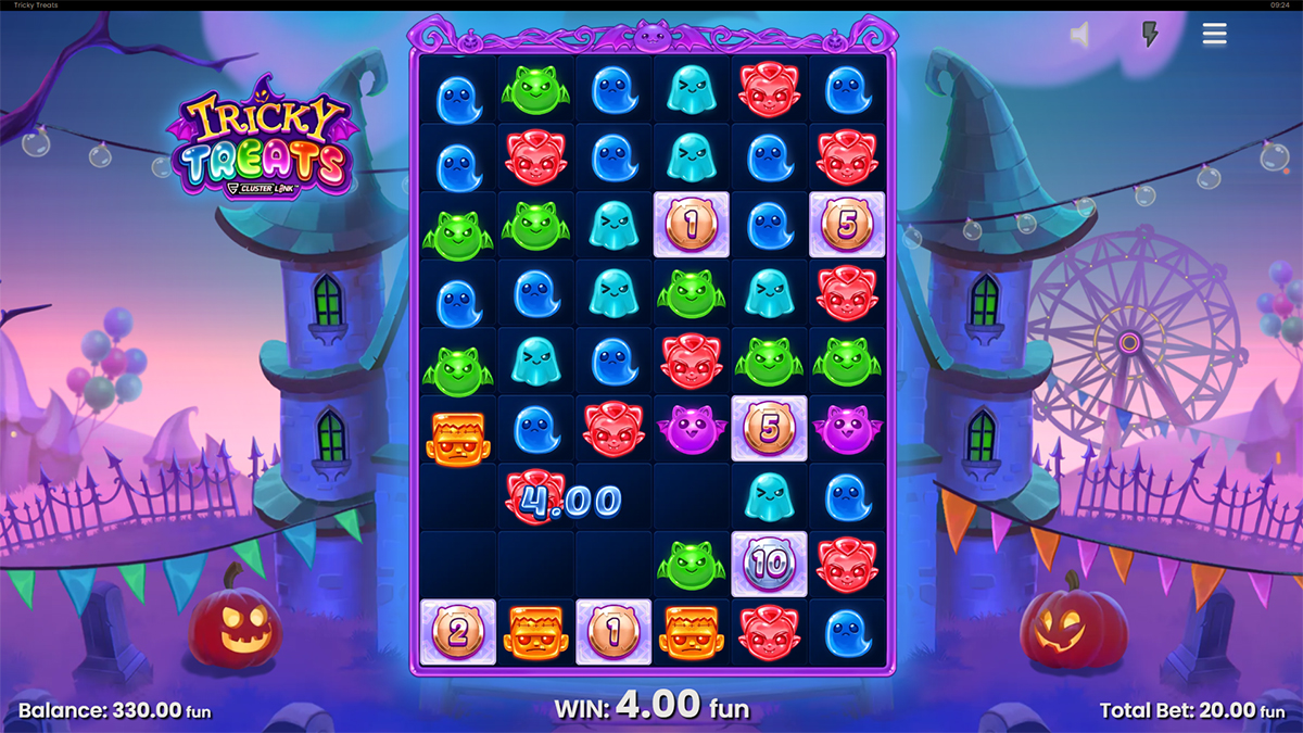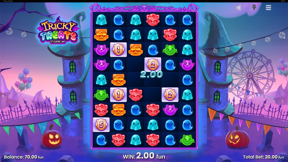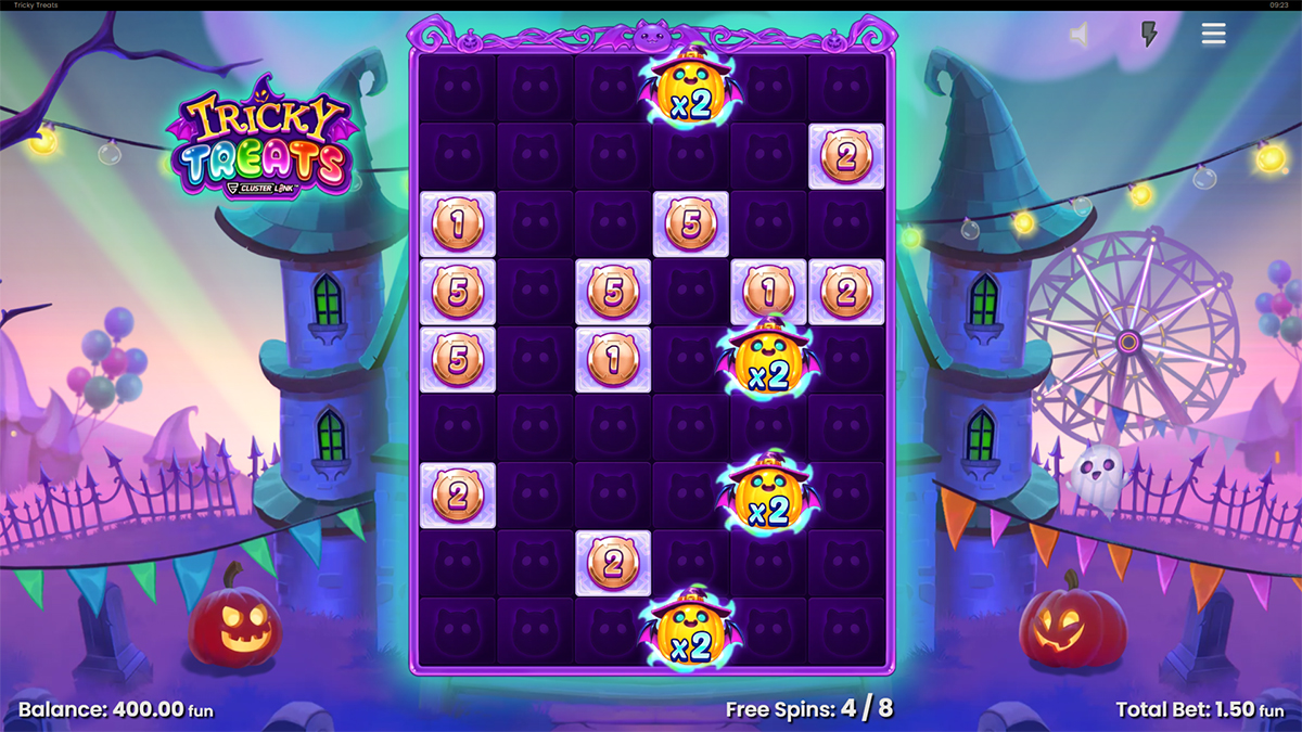 Tricky Treats is packed with innovative features that boost gameplay variety and winning potential. Each feature adds a unique twist to the cluster-pays mechanic and can lead to major rewards.