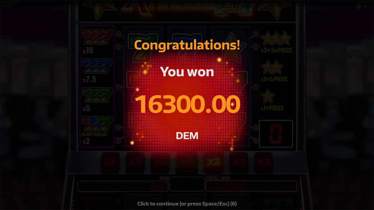 95-96 RTP RangeUltraXtreme 777 has an RTP of 95%, which is slightly below the market average but still fair for a game designed around quick-fire spins and straightforward mechanics. This payout percentage means that, on average, players can expect a return of 95 credits for every 100 wagered, though actual results will fluctuate due to variance. The RTP aligns with the slot’s design, where entertainment and bonus features balance out the slightly lower theoretical return.