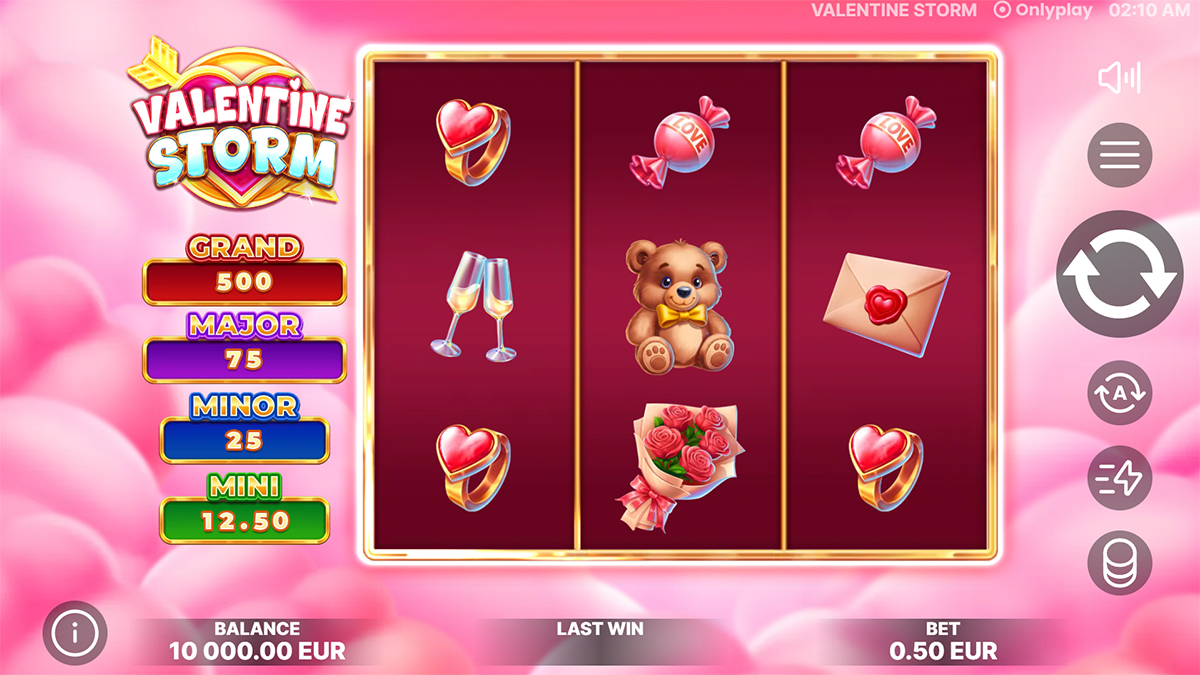 Valentine Storm operates with medium volatility, which creates a balanced risk-to-reward profile that suits a wide range of playstyles. This volatility level means players can expect a combination of regular smaller wins and occasional larger payouts, particularly when the Coin Game and jackpot features are triggered. Medium volatility helps keep gameplay exciting without being overly punishing, allowing bankrolls to last longer while still offering the potential for meaningful rewards. It also complements the game’s frequent feature triggers, ensuring that players experience steady action while still maintaining the thrill of chasing high-value outcomes. This balance makes the slot appealing for both relaxed play and more intense, feature-focused sessions.