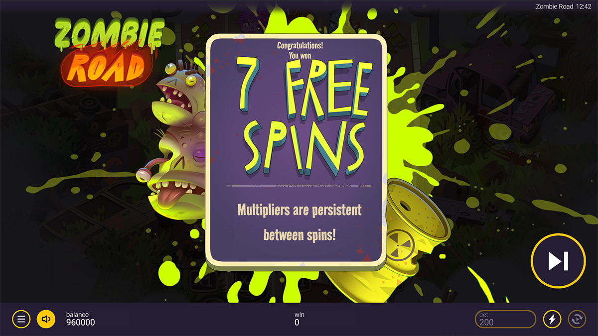 Yes, Zombie Road includes a thrilling Free Spins round triggered by landing 3, 4, or 5 Scatter symbols. This feature awards 7, 9, or 11 free spins, and during the round, multipliers remain persistent between spins. Players can also earn extra spins by landing more Scatters, extending the excitement.