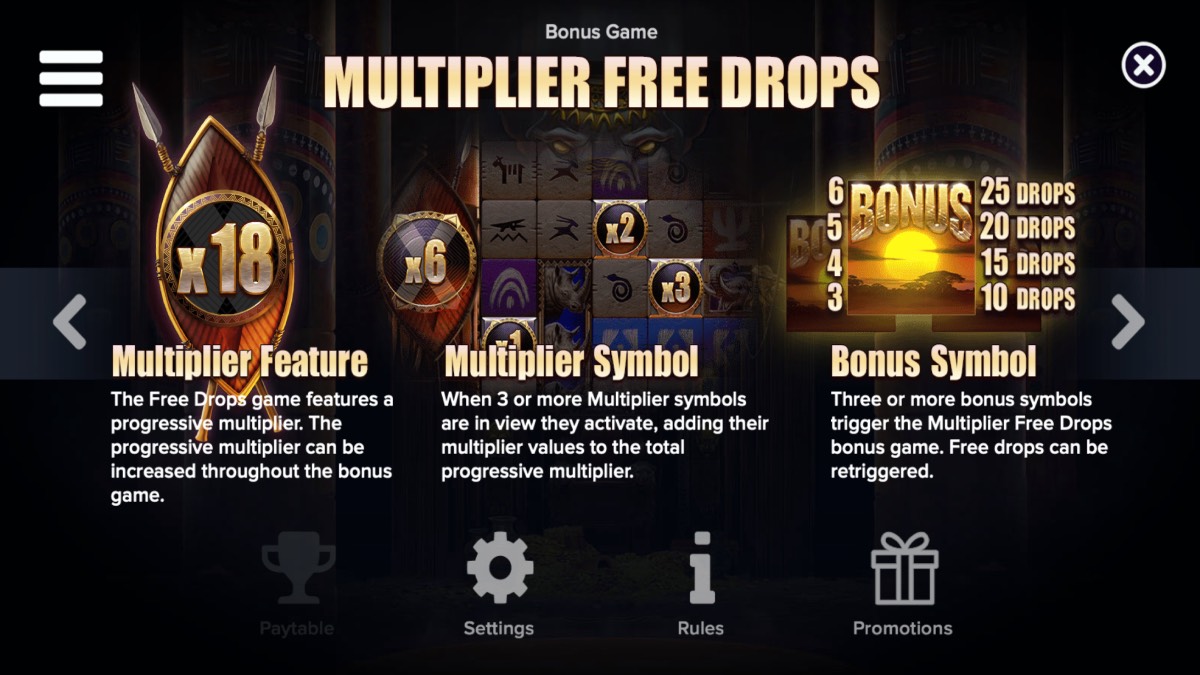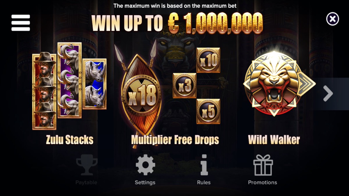 Set against the backdrop of Lesotho and the KwaZulu-Natal region in Southern Africa, the game immerses players in an adventurous expedition where animals are depicted offering gold to their gods. It features a 6-reel, 4-row layout with dropping symbols, creating dynamic gameplay as winning combinations disappear to make room for new symbols. The slot includes stacked and oversized symbols, walking wilds, and a bonus game enhanced with progressive multipliers, all of which work together to keep each spin engaging and full of potential for significant wins.
