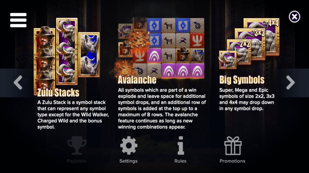 Important symbols include Wild Walkers, Charged Wilds, Zulu Stacks, and Multiplier symbols, which play a key role in triggering features and boosting payouts.