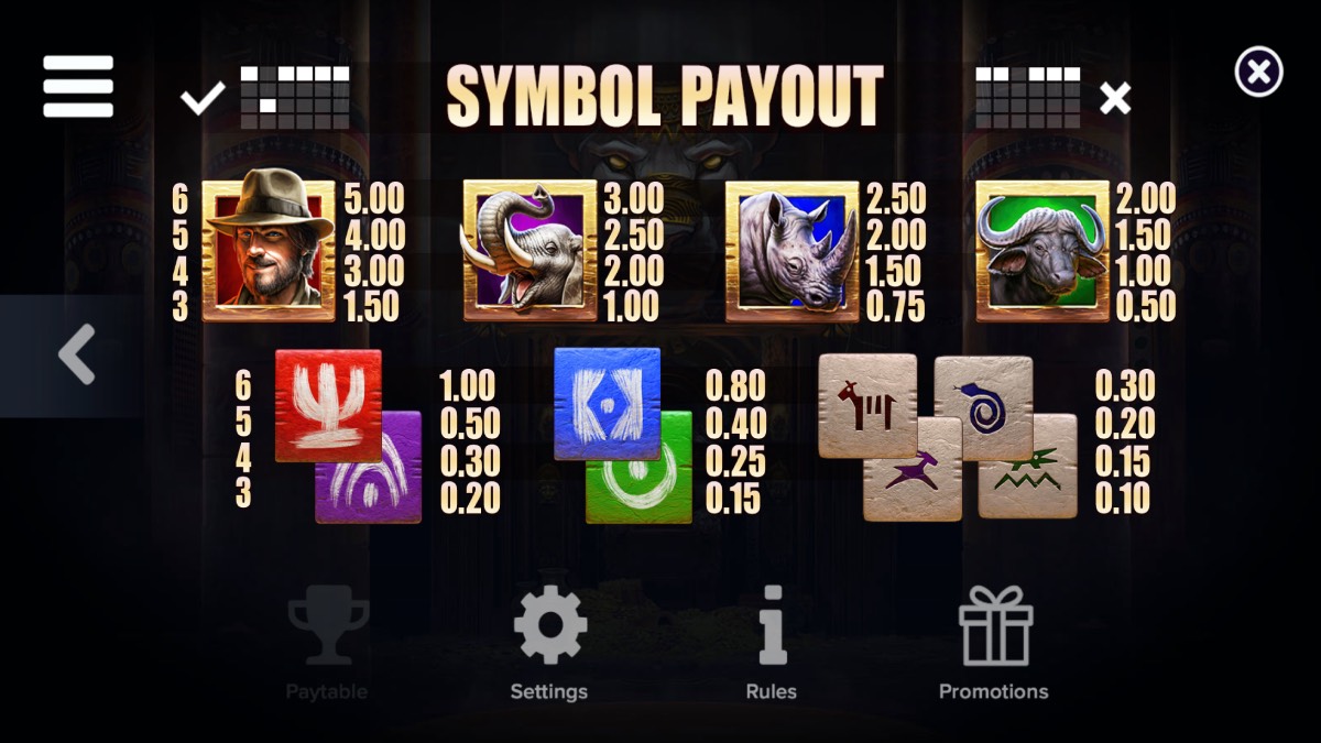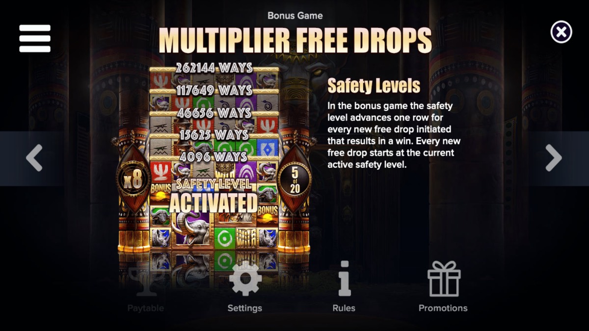 The gameplay of this slot immerses players in an African adventure filled with wildlife and exploration. It features a 6-reel, 4-row layout with 4,096 ways to win, offering a highly dynamic and engaging experience. The game includes 12 distinct symbols, ranging from low- to high-value icons, as well as special symbols that trigger its various bonus features. Combined with the dropping symbols mechanic, the layout ensures that each spin can lead to multiple consecutive wins, keeping the action fast-paced and rewarding while staying true to the adventurous animal-themed setting.