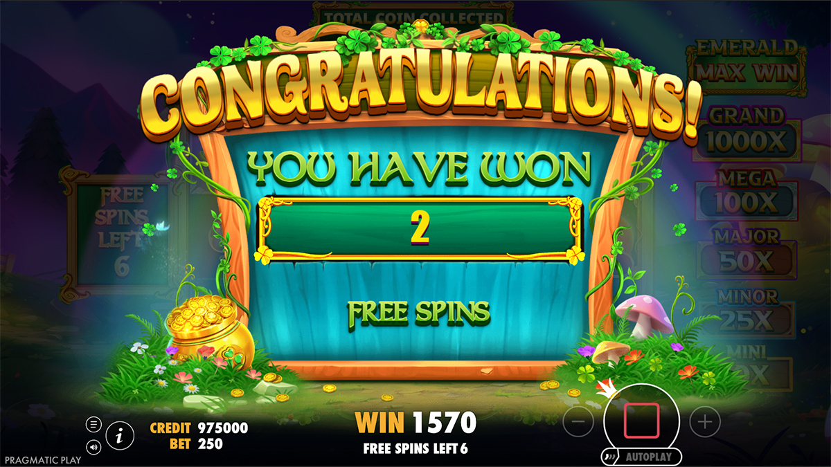 Money Collect Money symbols with values from 1x to 8x or jackpot icons (Mini, Minor, Major, Mega, Grand, Emerald) are collected when wilds appear on the leftmost or rightmost reels.