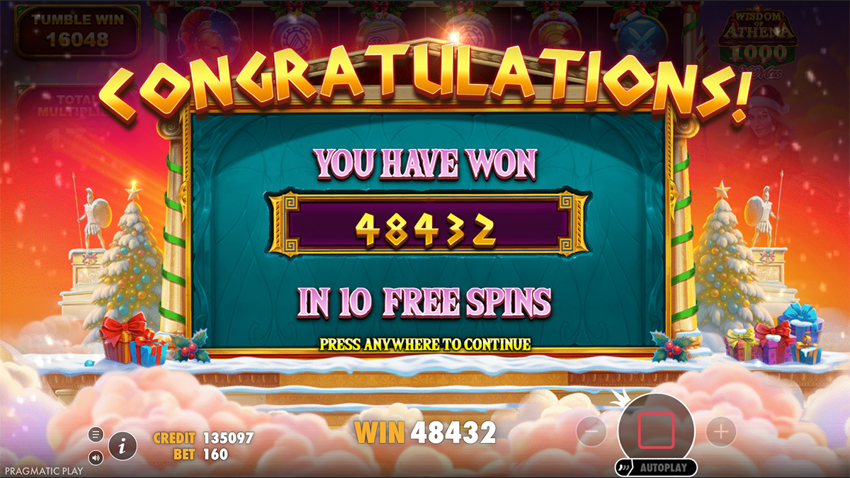The maximum win available in Wisdom of Athena 1000 Xmas reaches an impressive 10,000x the bet, making it capable of delivering thrilling top-tier payouts. Achieving this outcome requires a combination of deep tumble sequences, high-value clusters, and strong multipliers. While rare, the max win is attainable during highly volatile bonus rounds where the Total Multiplier can skyrocket.