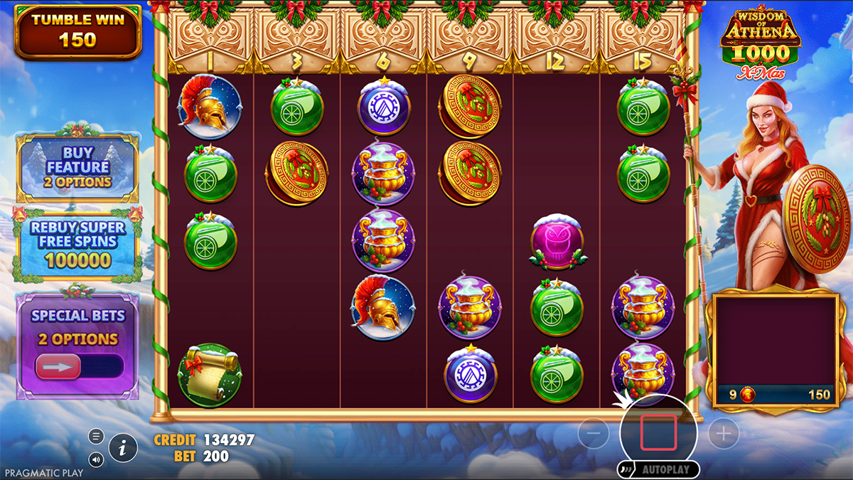 Mechanically, Wisdom of Athena 1000 Xmas expands its depth through a combination of the Tumble system, progressive top-row unlocking, powerful multiplier symbols, and multiple paid enhancement options like the Special Bets and Feature Buy modes. The top row begins locked and gradually opens through increasing tumble counts, creating a dynamic sense of progression within every spin. Multiplier symbols, which can hold enormous values up to 1000x, further intensify the potential by combining their totals at the end of each tumble sequence and applying them to the total win. When paired with options like the Ante Bet or the Super Spin mode—each adjusting RTP and frequency conditions—the mechanics offer layered gameplay that rewards risk-taking and rewards players who enjoy evolving board states, strategic enhancements, and high volatility.